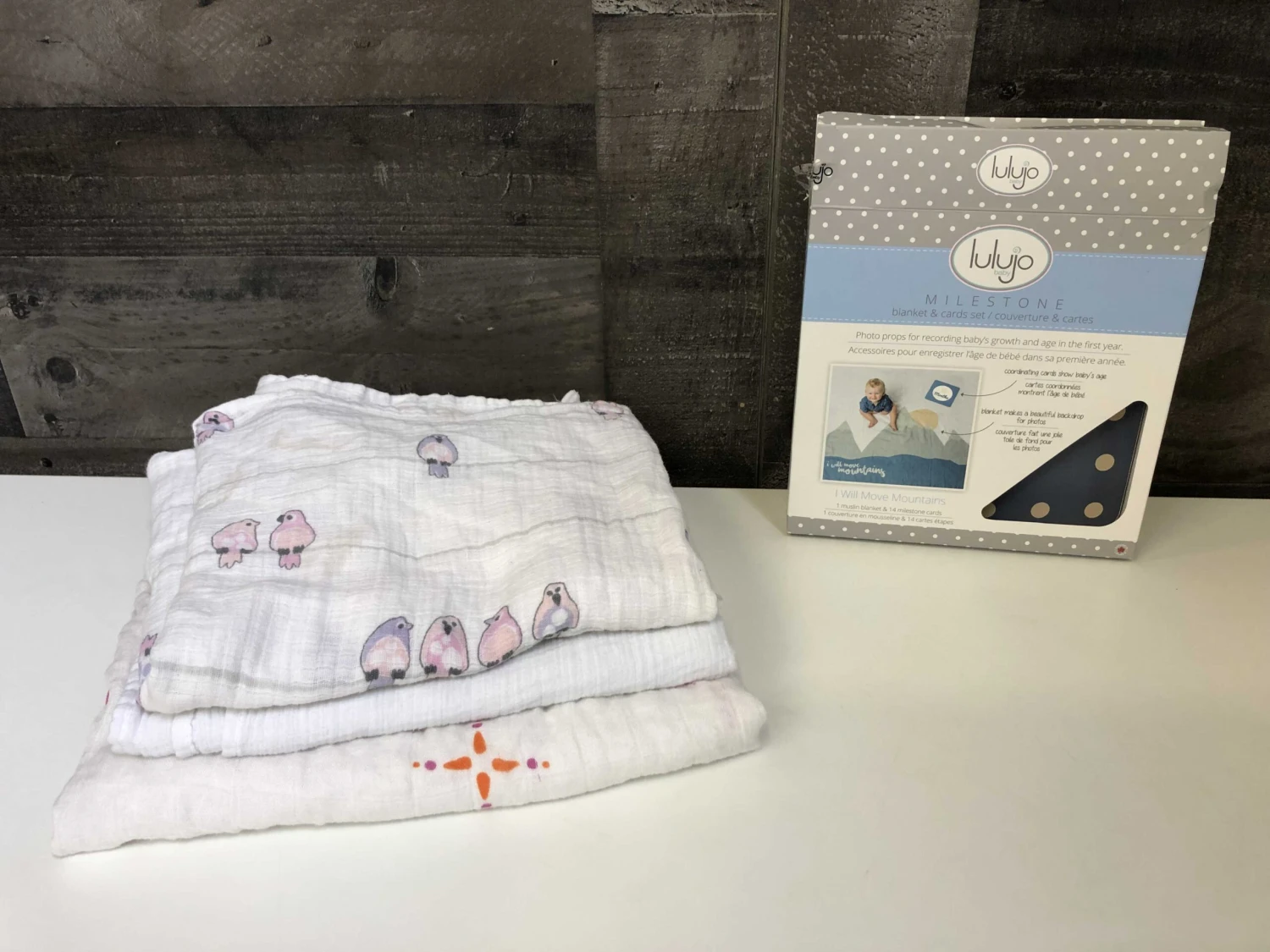 “Great set of versatile blankets! Two are made of soft breathable cotton muslin and the larger pink and orange design is made with viscose bamboo. As a bonus, a set of lulujo milestone cards are included.”