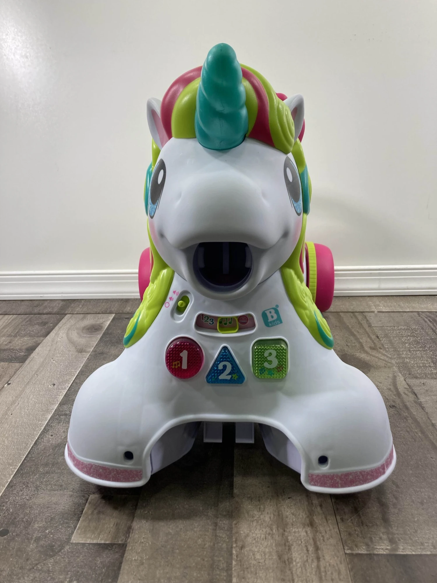 “For ages 6-36 months. Babies can enjoy sitting, walking or riding this adorable unicorn while delighted with lights and 50+ phrases and melodies. Teaches about colors, shapes and numbers. “