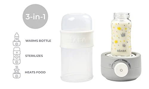 “This elegantly designed bottle warmer is small in size yet big in features, so you can have warm sterilized bottles for your little one while keeping that coveted counter space! It’s a bottle warmer, food jar warmer, and sterilizer in one! The ultra quick heating system warms bottles to perfection in just 2 minutes.”