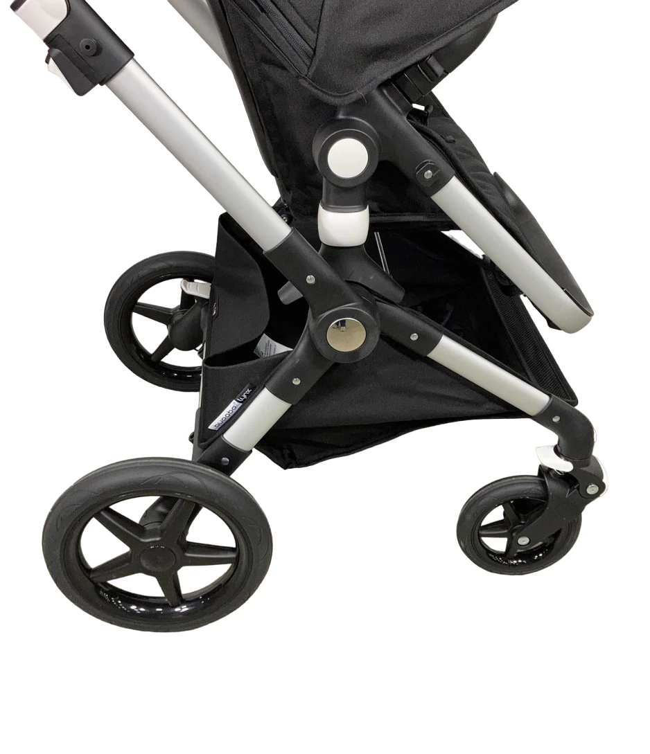 “This lightweight stroller is full-size, but at only 20.7 pounds, it is easy to maneuver and take along anywhere you want to go! The Lynx features an easy one-hand push, puncture-proof wheels, a large under basket that holds up to 22 pounds, a three-position recline that works for the forward or rear facing seat, and so much more. This stroller is designed to hold up to 50 pounds and comes with a faux leather handlebar. The Lynx is a stylish stroller with all your favorite Bugaboo features.”