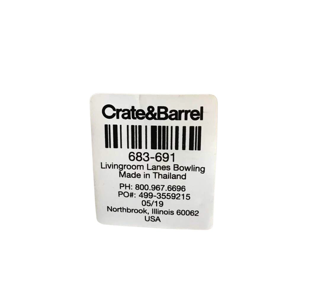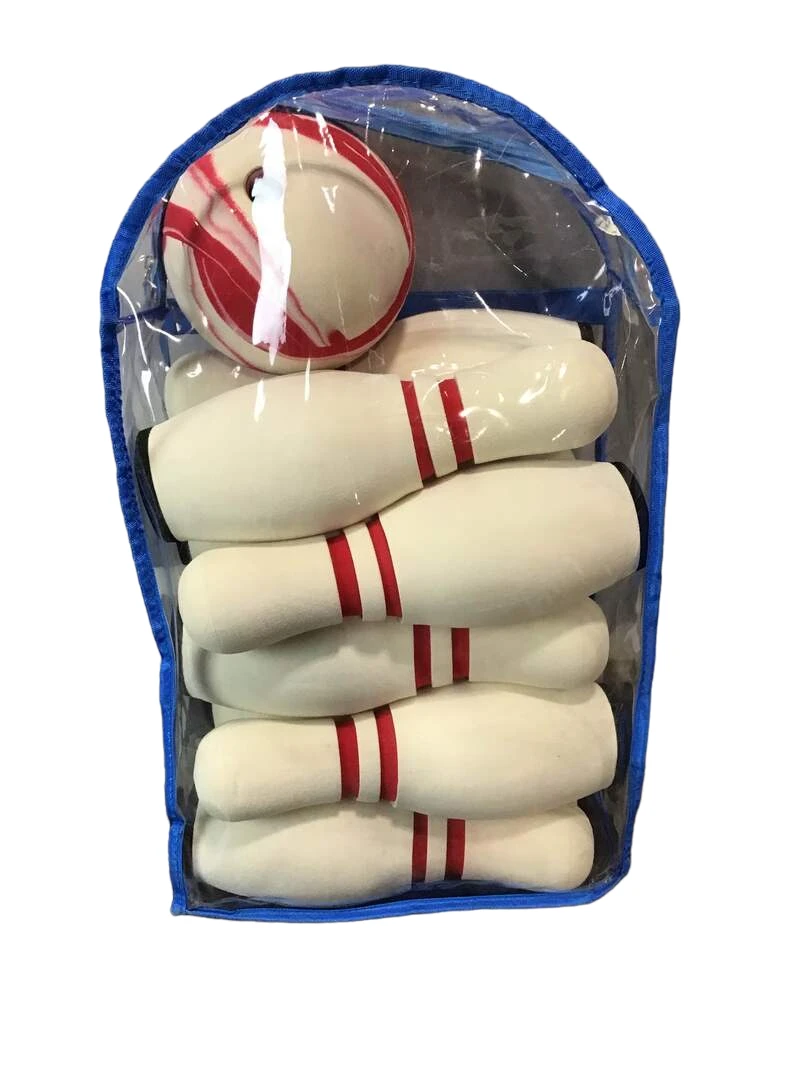 “Set up an exciting bowling game in any room. Includes 10 pins and ball made of natural rubber and travel bag.”