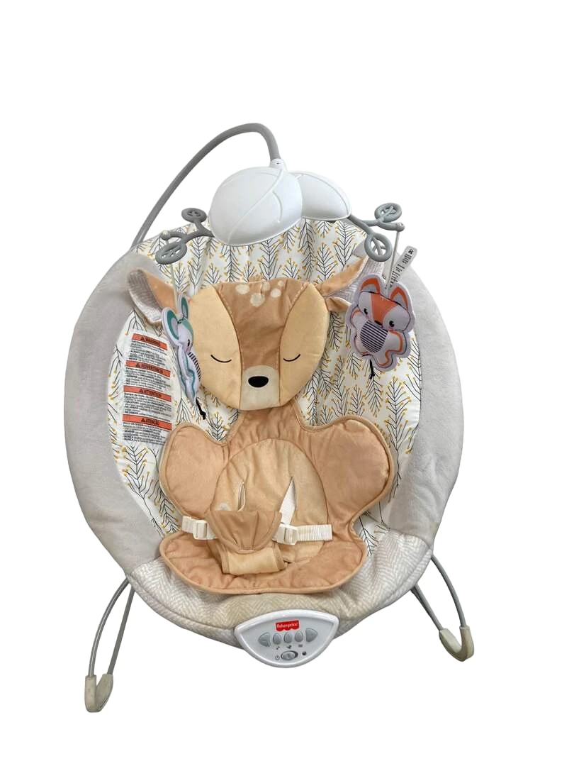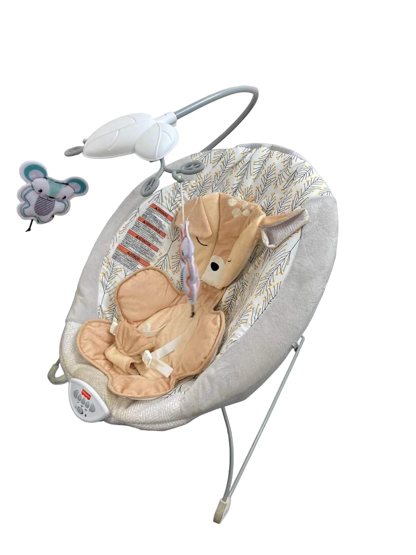 “Wind your baby down in this comfortable bouncer with its rocking motions and soothing music.”