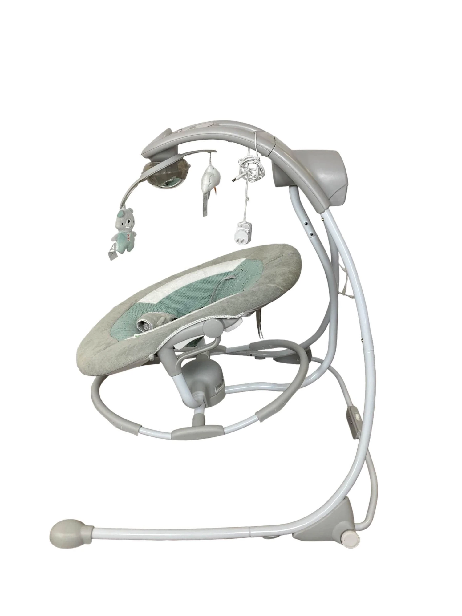 “This swing is designed for newborn babies up to 9 months old or up to 20 pounds. It can be used as a swing or as a stand alone rocking seat that you can move wherever you are to easily keep an eye on baby. The swing features 6 speeds, a 2 position recline, a 180 degree rotation and gentle vibrations. Works with batteries or with an AC adapter. “