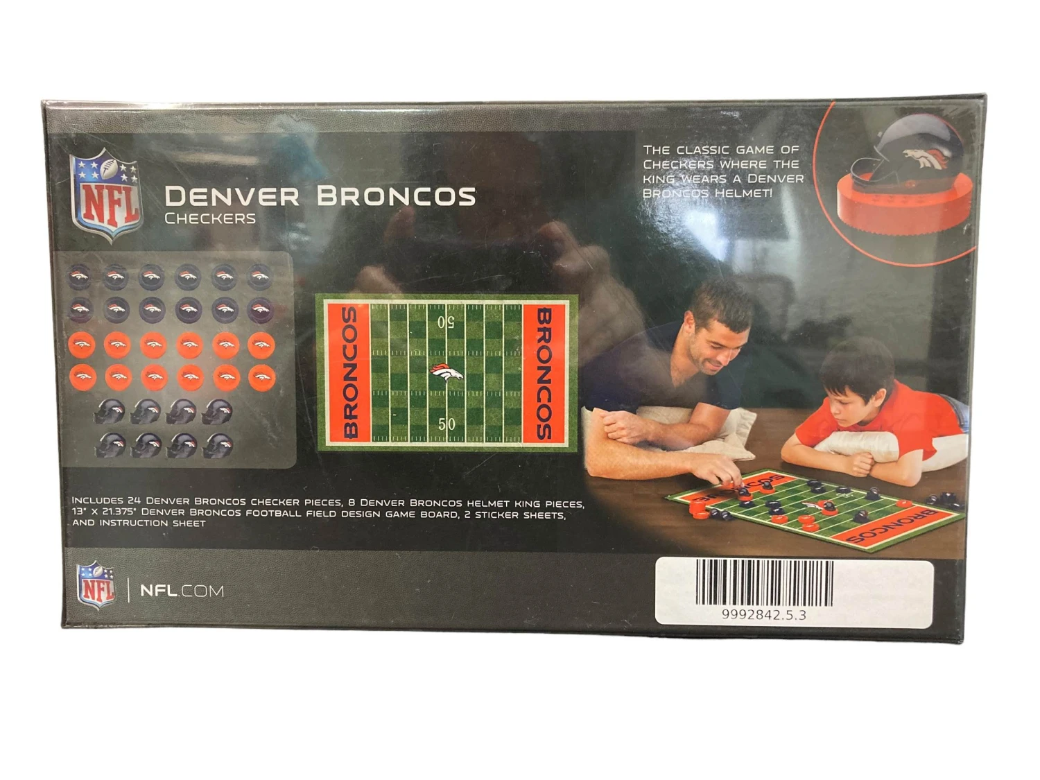 “Classic checkers game board that looks like football field with Denver Broncos logo. Officially licensed nfl product”