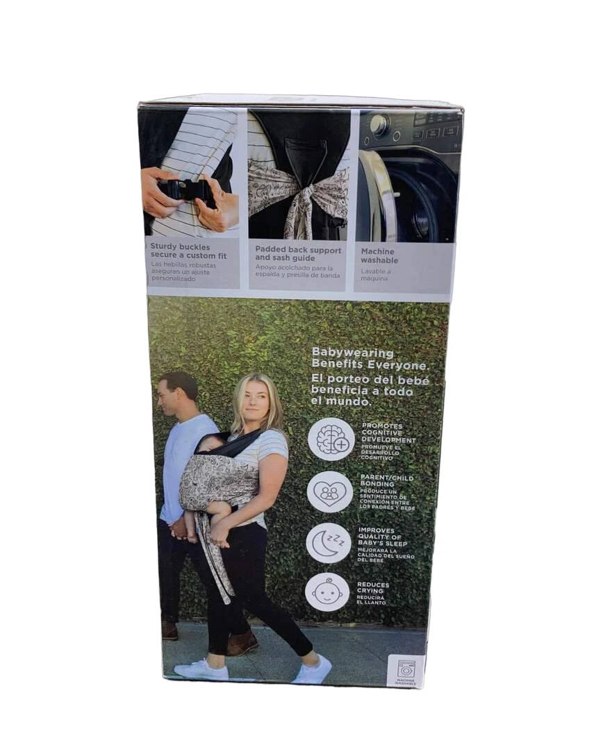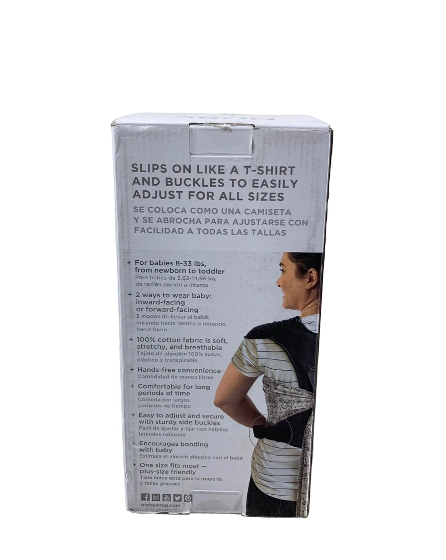 “This easy to use wrap slips on like a shirt and buckles on the sides. It is simple to adjust and fits parents of many shapes and sizes. It holds newborns and children up to 33lbs front facing-in or front facing-out.”
