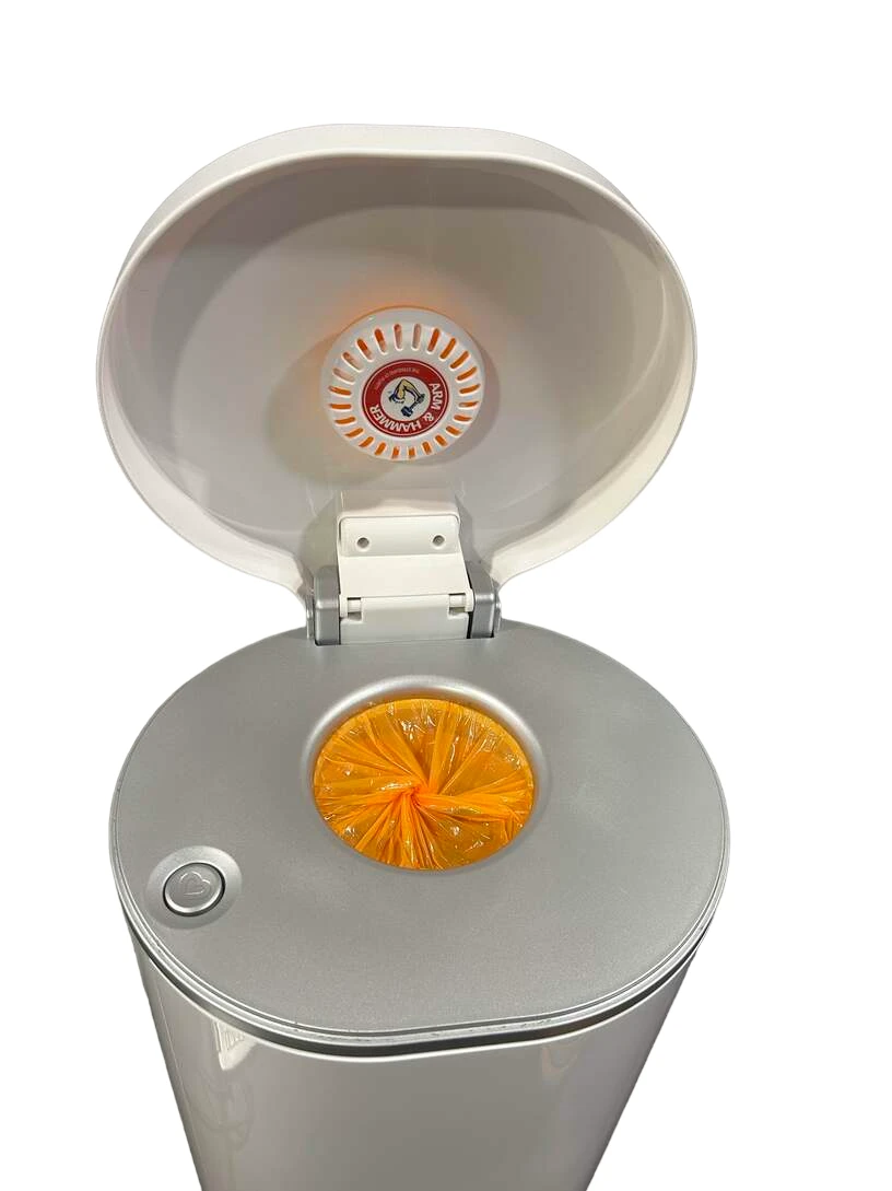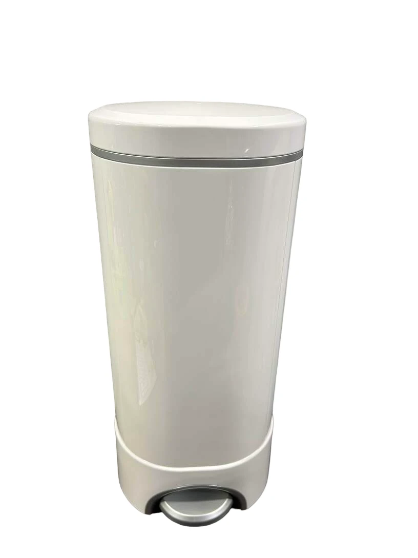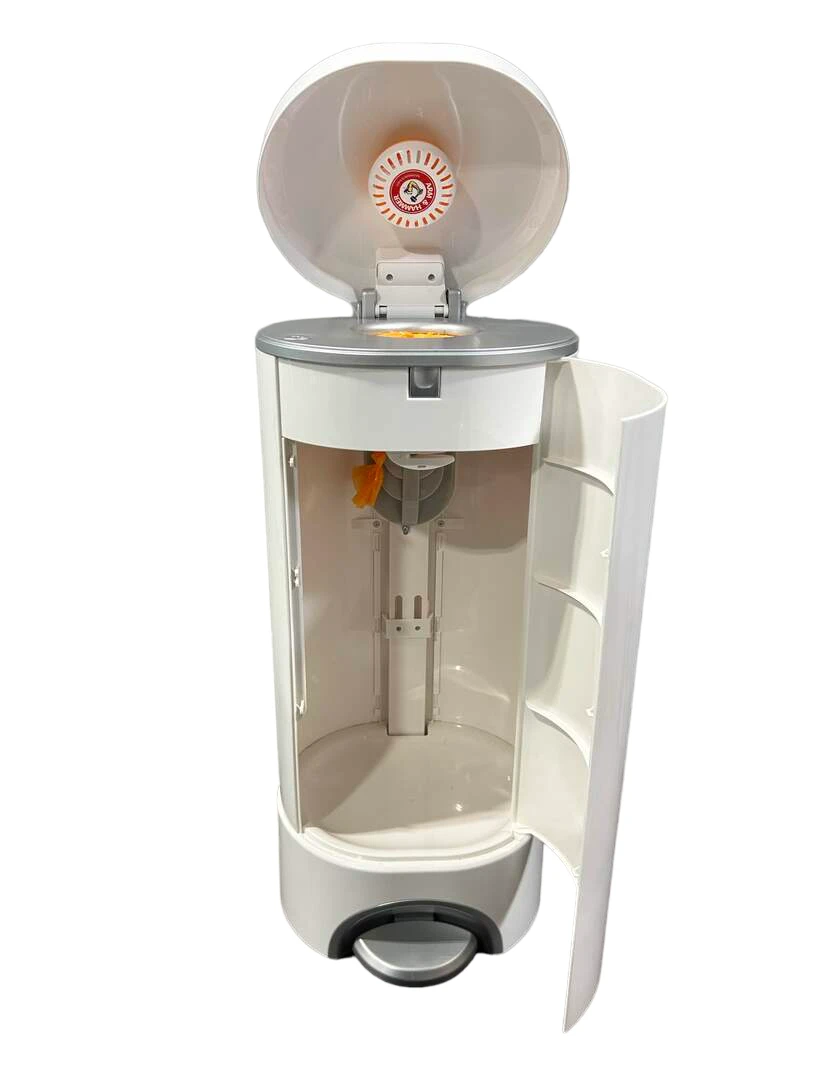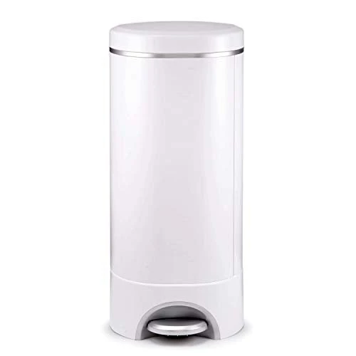 “Keep your nursery smelling fresh with this handy diaper pail that locks odors inside with Arm and Hammer control. The foot pedal makes this system completely hands free. Works with rings and bags.”