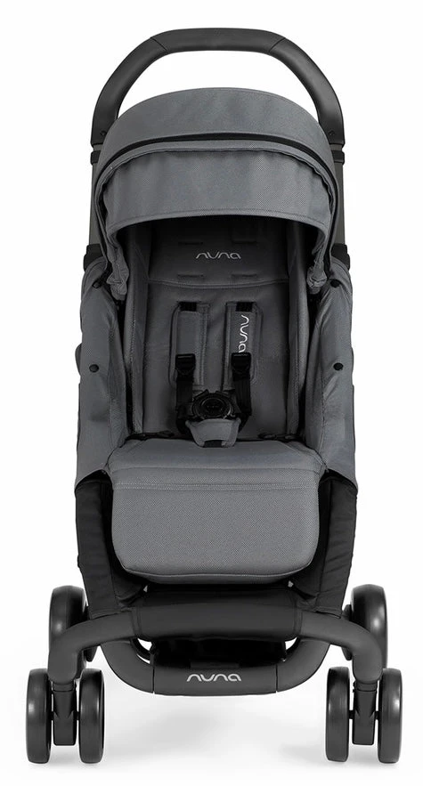 “Small yet mighty, this compact travel stroller may just change your life! The easy to maneuver design is as perfect for travel as it is for every day use as it effortlessly navigates through crowds with only one hand. Features an ultra compact fold-in-half design, comfy padded seat with a full recline, height adjustable handlebar, removable storage basket, swivel front wheels, a stand alone fold, and so much more! The 5-point harness keeps your little one safely riding from birth to preschool and the chic design will make you smile. Comes standard with adapters to securely fit the Nuna PIPA, Maxi-Cosi Mico, Maxi-Cosi Prezi, and Nuna Aton infant car seats.”