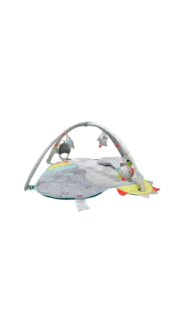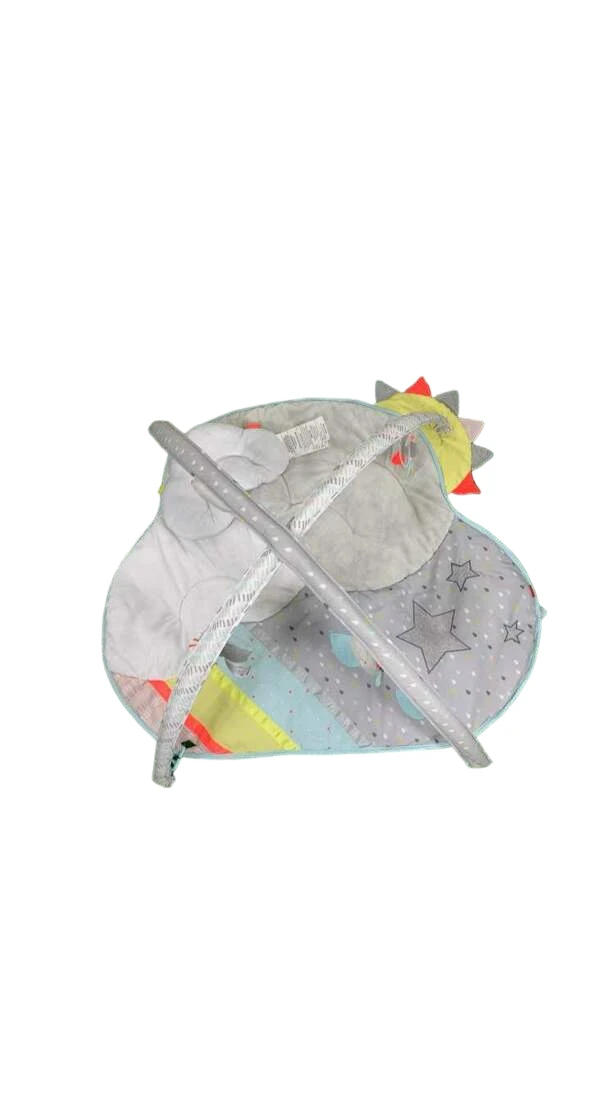 “Every cloud has its silver lining! This play mat features plush comfy fabric with soft neutral tones and bright neon accents to stimulate baby’s sight. Hanging toys crinkle, play music, and light up.”