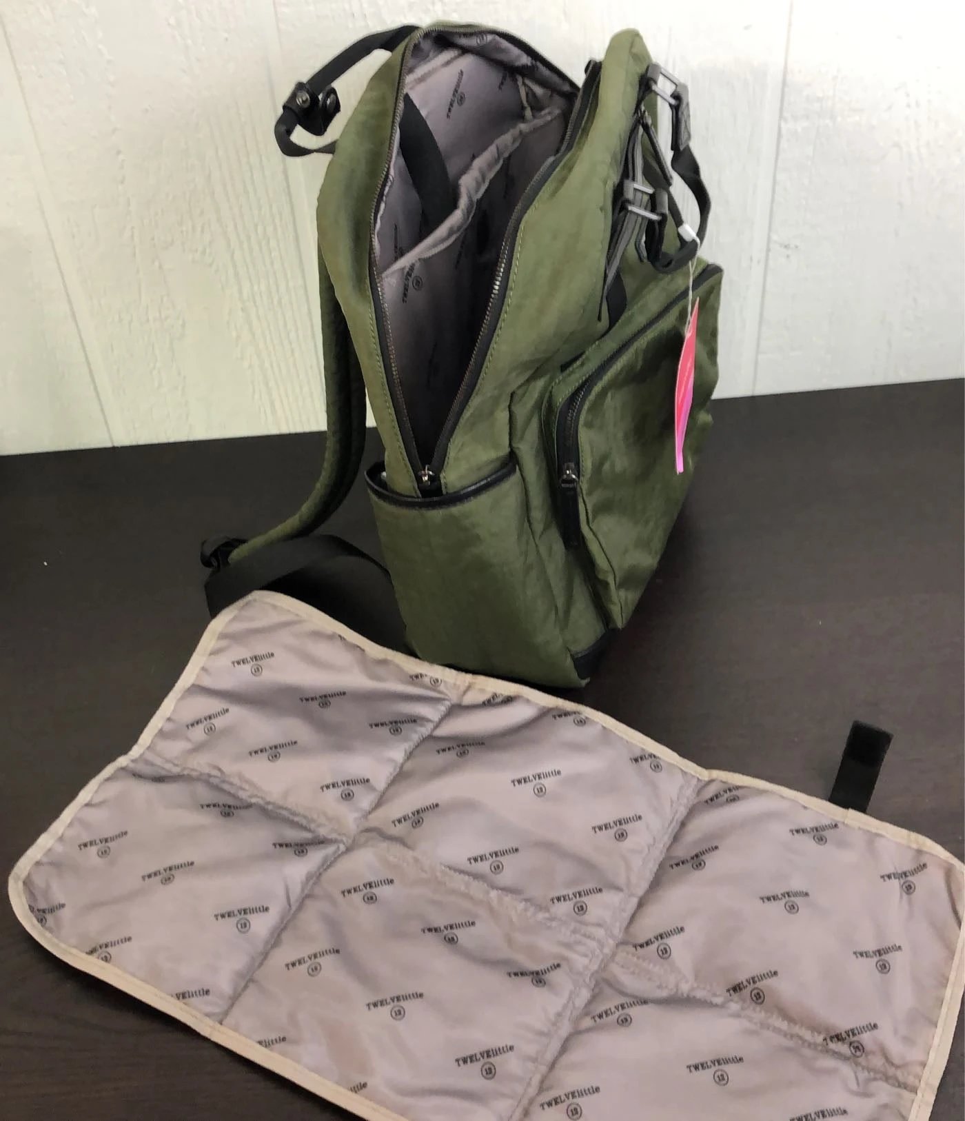 “This comfortable water resistant backpack is ideal for storing everything you need when you are out and about. It even includes a changing pad for those on the go potty breaks.”